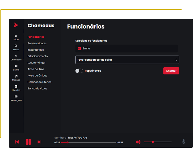 Player interativo que permite realizar chamadas de funcionários, estacionamentos, abertura, encerramento ou qualquer outro aviso.